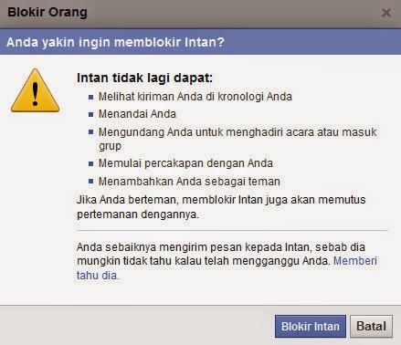 Klik tulisan Blokir yang sejajar dengan foto profil teman atau orang lain yang ada di facebook anda. Dan anda akan mendapati tampilan selanjutnya seperti.